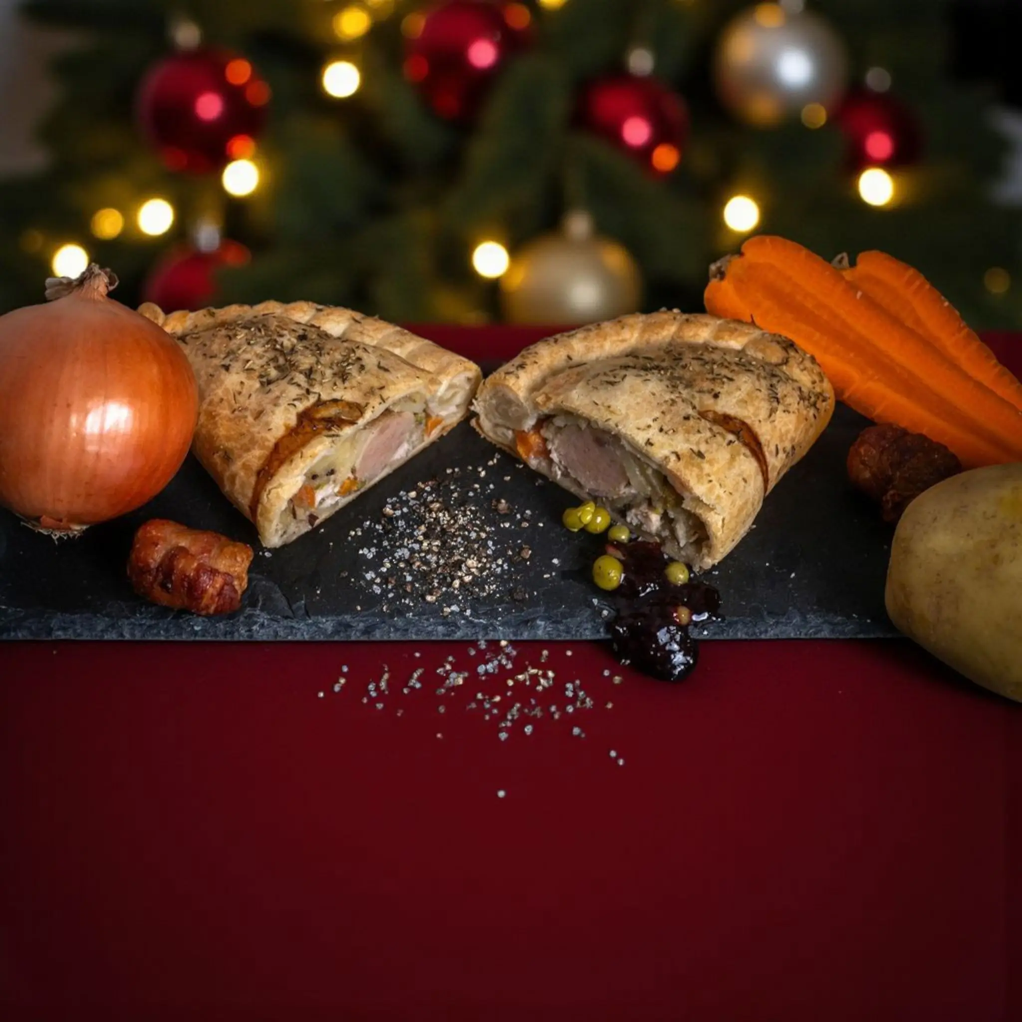 Hand-layered marinated turkey, cranberry sauce, sage & onion stuffing, and even a pig in blanket on top — all tucked inside our golden, hand-crimped pastry.