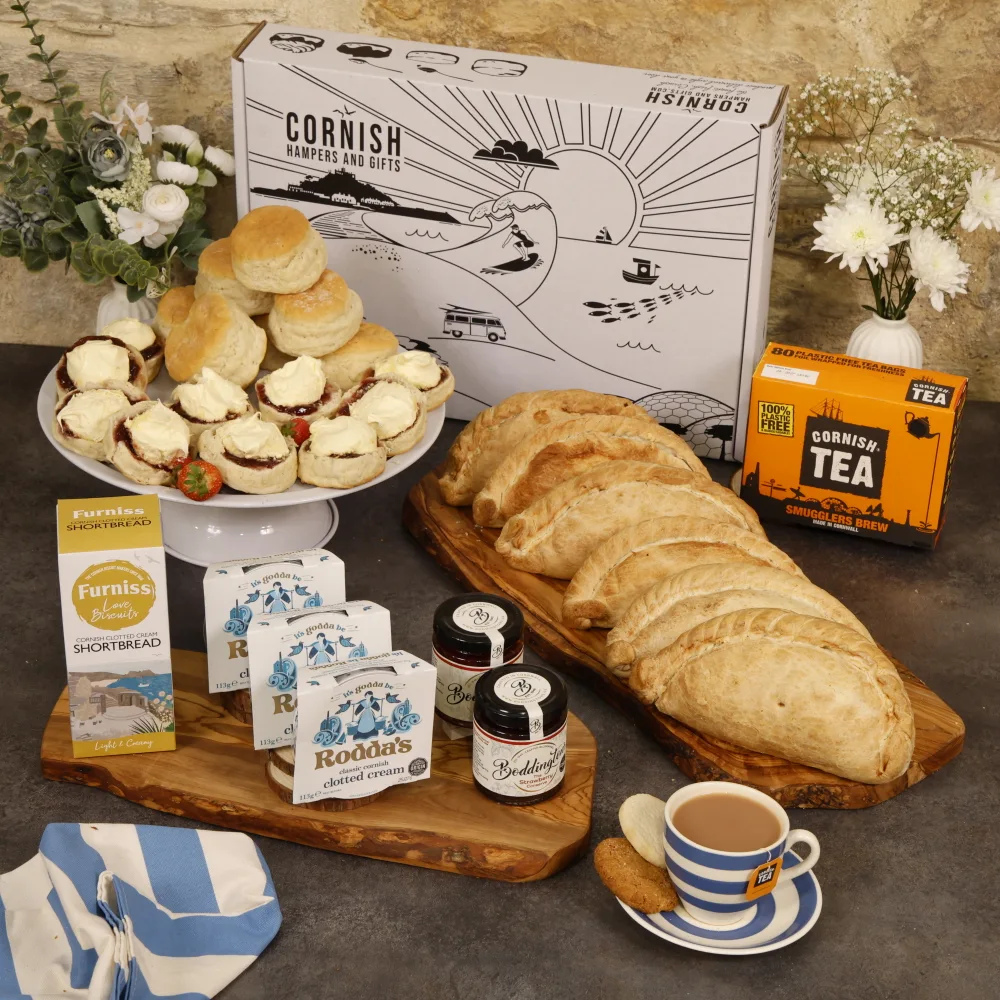 This hamper showcases our most extensive selection of pasties and cream teas, representing a genuine celebration of Cornish culinary traditions. Our handcrafted, traditional pasties utilize locally sourced ingredients, delivering exceptional flavours that evoke the essence of Cornwall. Complemented by our classic cream teas, featuring light scones, Cornish clotted cream, and fruit preserves, this hamper offers an ideal experience for any occasion, from family gatherings to corporate events. We invite you to savour the authentic flavours of Cornwall with our premier selection of pasties and cream teas, all conveniently presented in a single, delightful hamper. We encourage you to place your order today and experience a genuine Cornish feast.